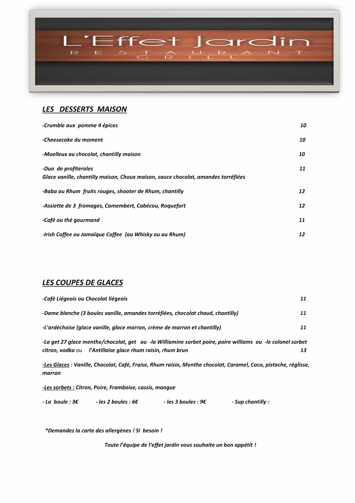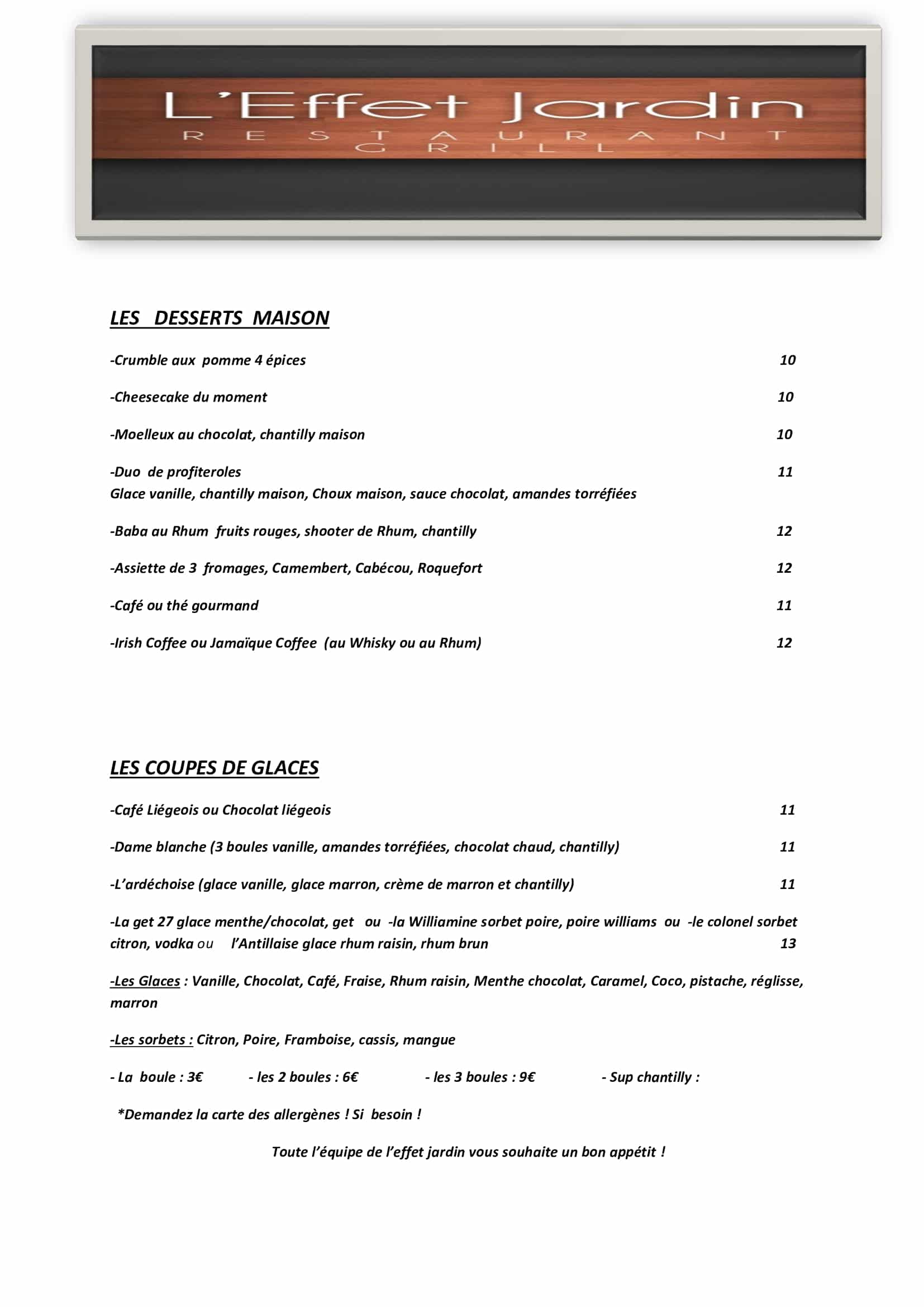 Les desserts *Si besoin, demandez la carte des allergènes ! Toute l’équipe de L’Effet Jardin vous souhaite un bon appétit !
